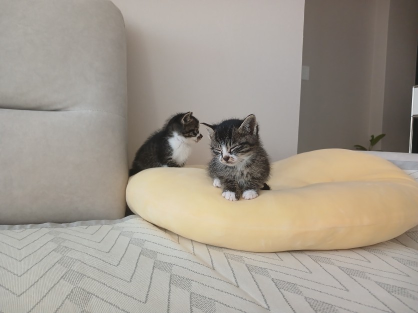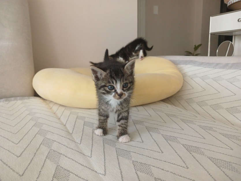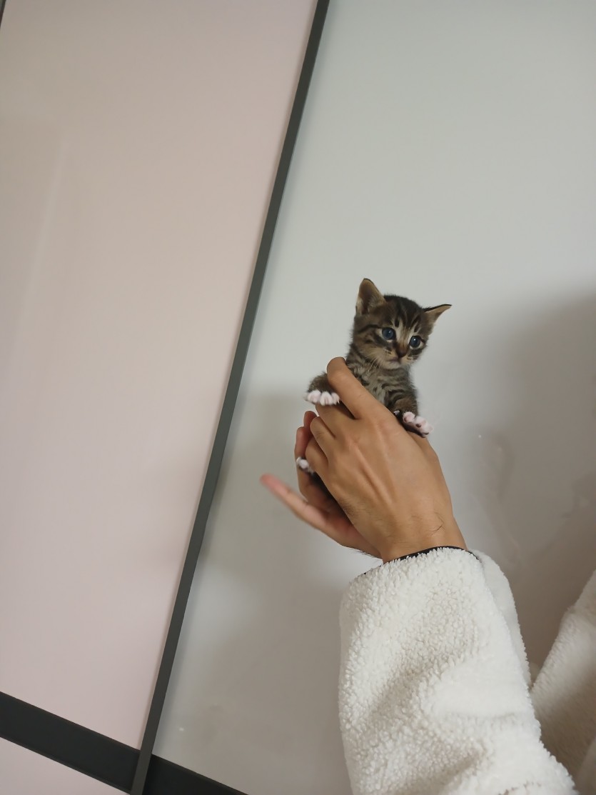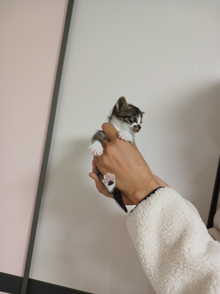 태어난지 한달된 아기고양이입니다 2주때 발견해서 분유먹이다가 이제는 이유식 먹고있어요! 어릴때부터 사람손타고 분유먹으며 커서 순하고 완전 개냥이에요 허피스도 없고 건강합니다! 대소변도 잘가려요 둘이 너무 잘 놀아서 같은 집으로 가면 좋겠지만 한마리만 데려가셔도 괜찮습니다