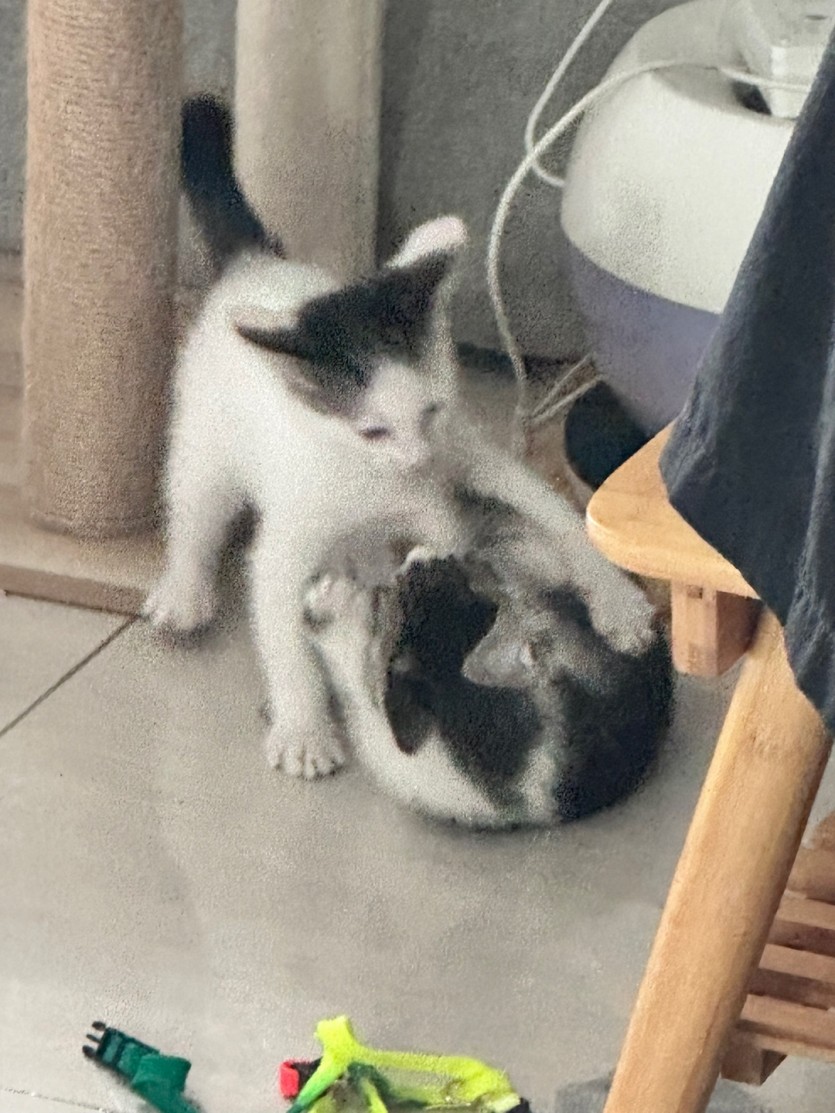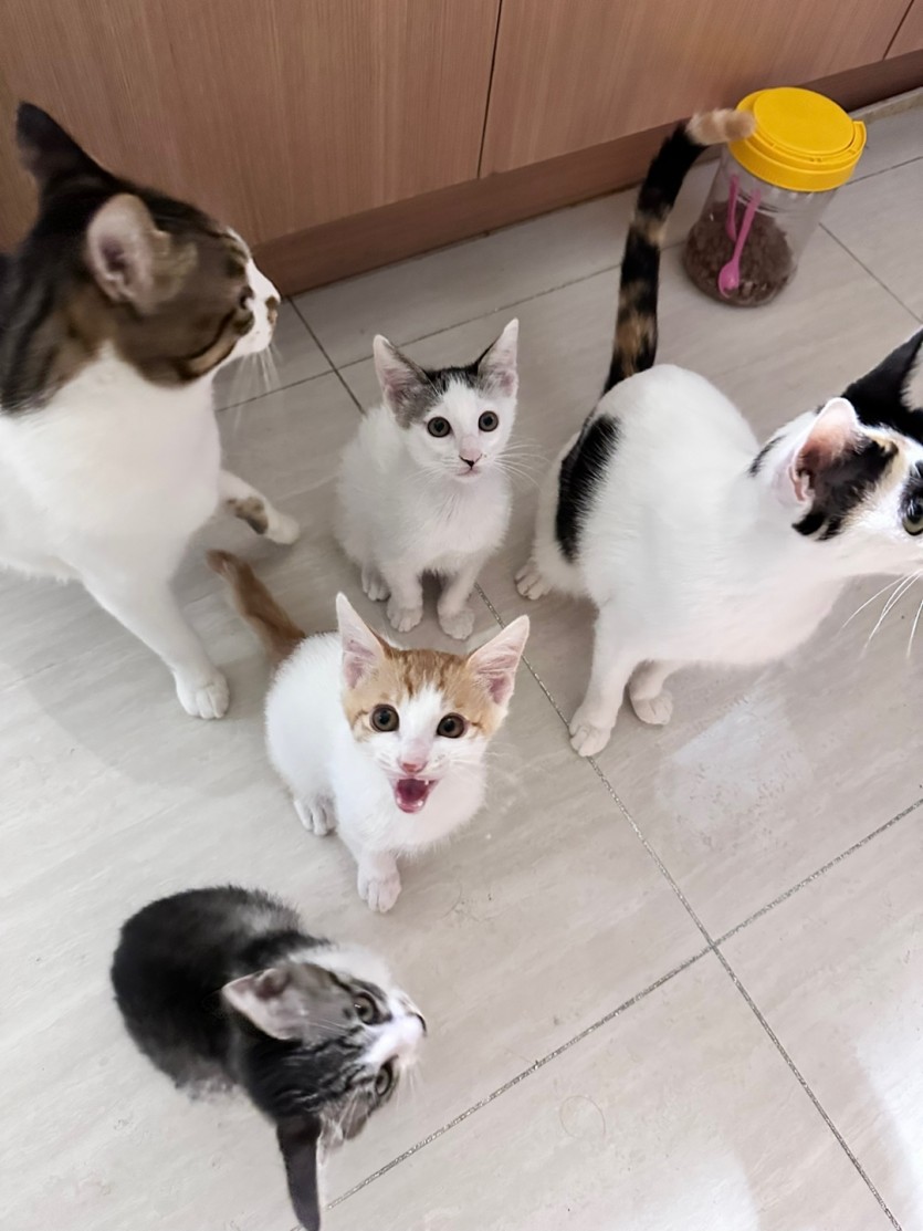 안녕하세요.작년 냥줍한 고양이들이 새끼를 낳아 무료 분양합니다.23년 8월 8일에 태어났으며,엄마 젖 떼고 사료 먹기 시작한 애기들이에요.