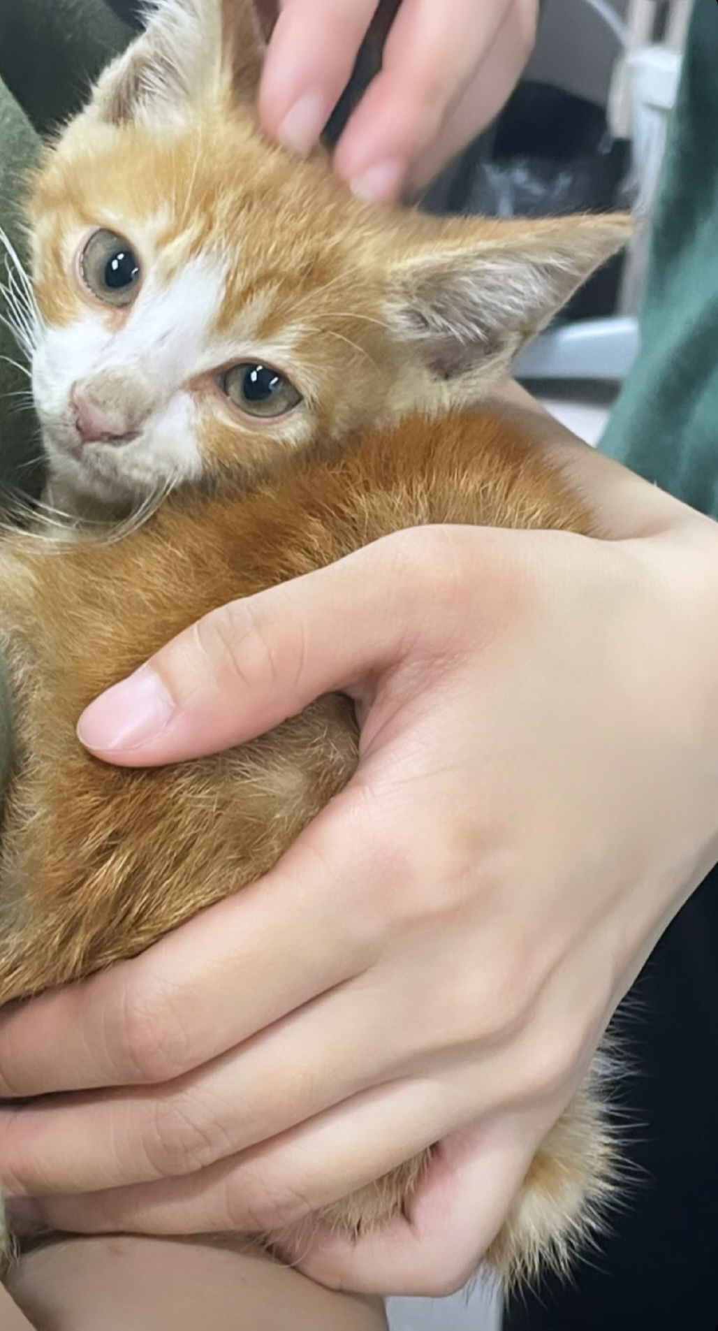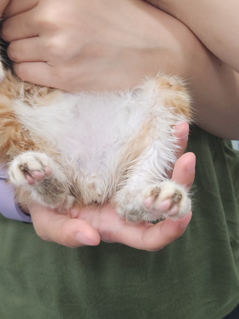아기고양이가 성격이 순해서 발톱한번 세우지도 않고 조용히 안겨있는 성향이라 애교묘가 될 것 같습니다.