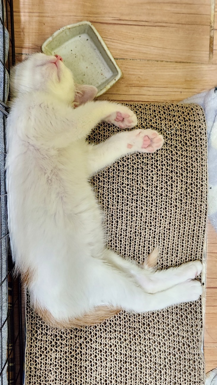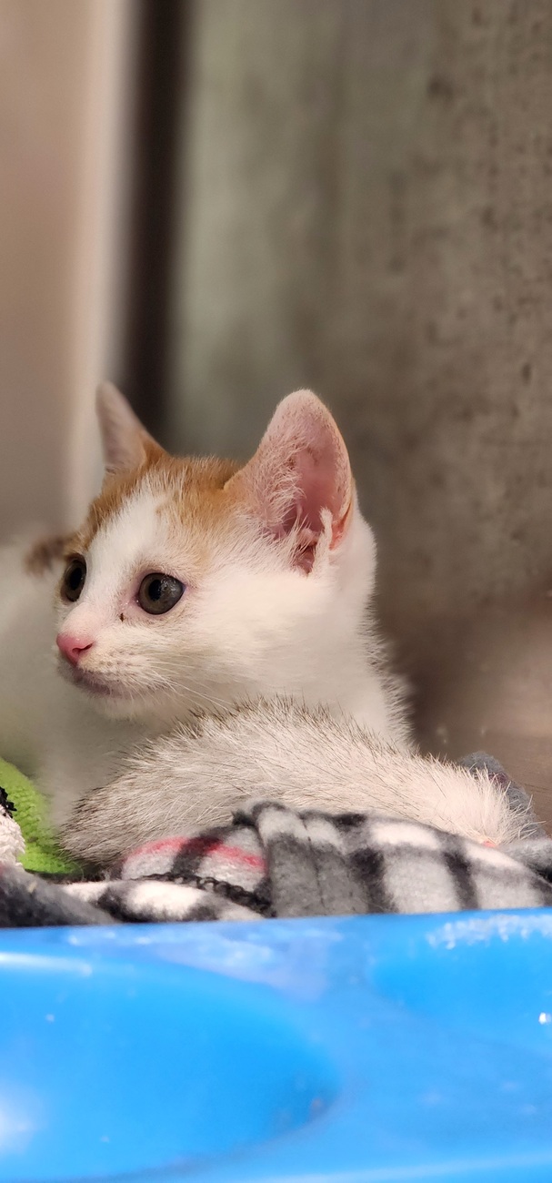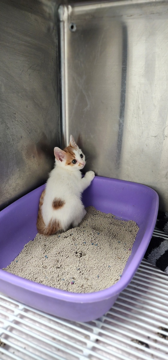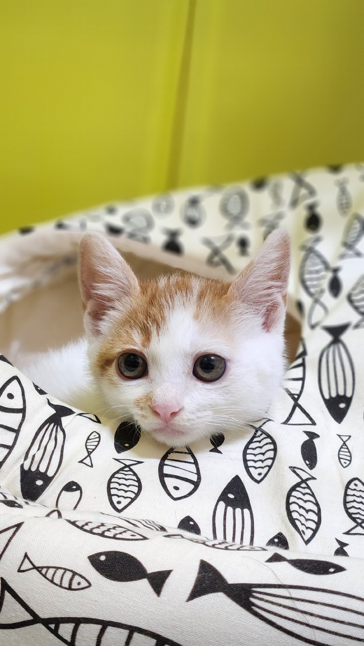 소리가 나면 겁먹고 화장실상자 구석으로 도망가는 게 최선인 너무나 순한 아가예요. 겁먹은 와중에도 장난감에는 또 신나게 반응하며 잘 놀고요. 쓰다듬어 주면 곧 편안하게 그릉그릉 졸고, 엄마를 찾듯이 머리부비기도 마구 해준답니다.