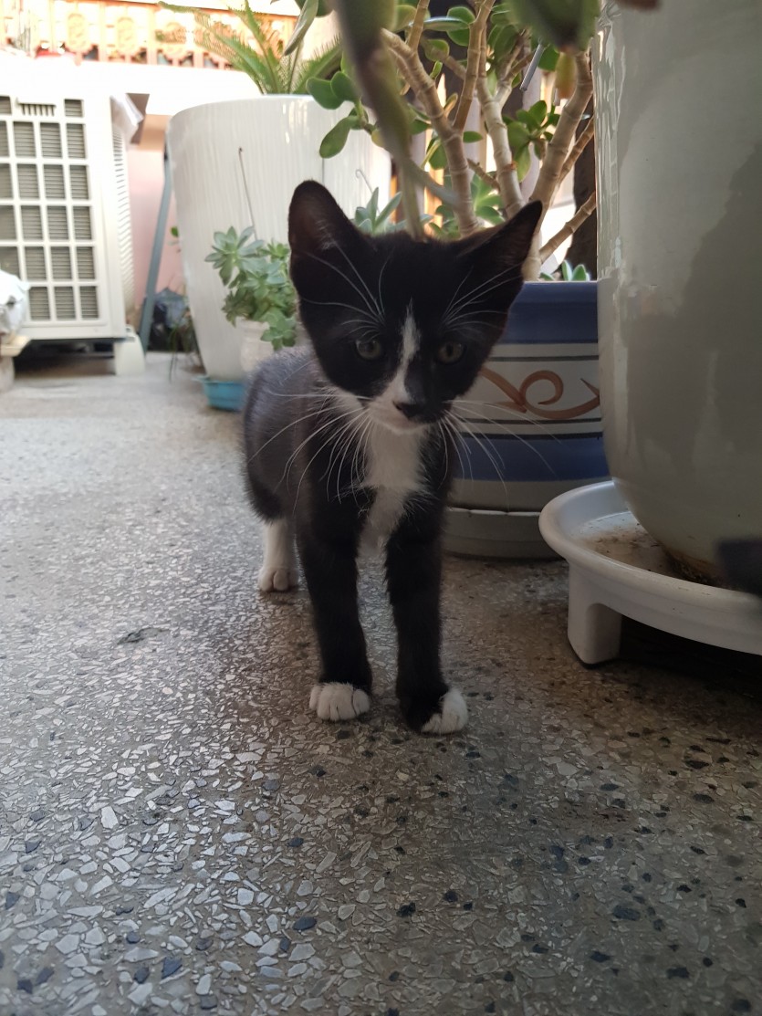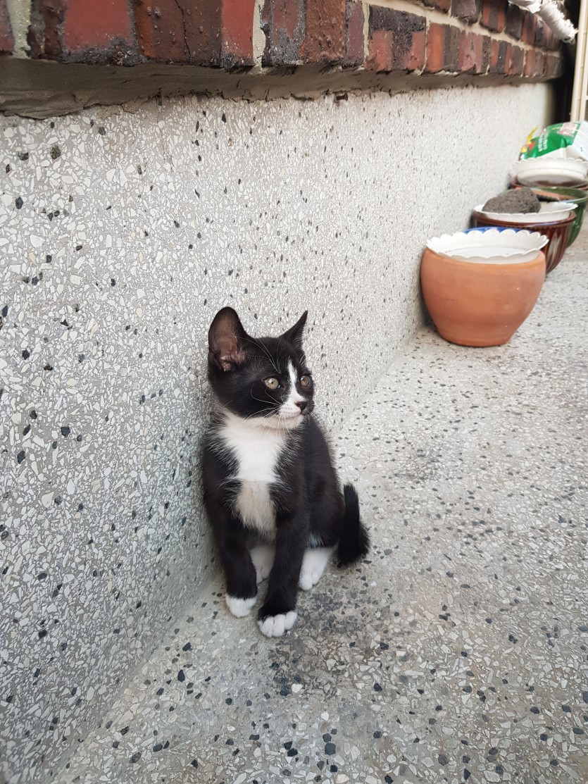 얼굴에 흰 얼룩 무늬가 너무 이쁜 턱시도 수컷냥입니다.