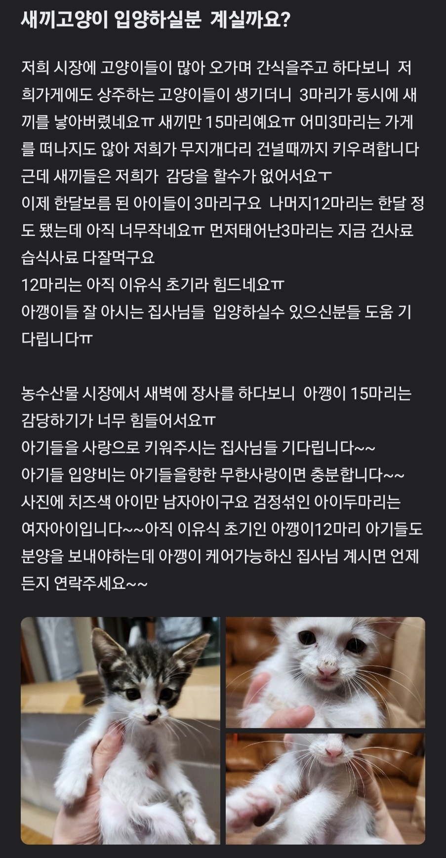 저희 시장에 고양이들이 많아 오가며 간식을주고 하다보니 저희가게에도 상주하는 고양이들이 생기더니 3마리가 동시에 새끼를 낳아버렸네요ㅠ 새끼만 15마리예요ㅠ 어미3마리는 가게를 떠나지도 않아 저희가 무지개다리 건널때까지 키우려합니다