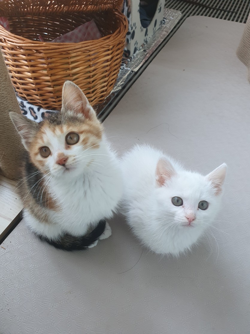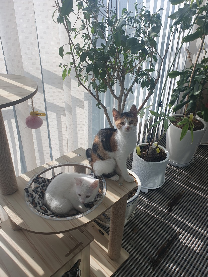 공격적이진 않은데 아직 애교는 없습니다. 밥먹거나 잘 때 만져줄 수 있고 삼색냥이는 좀 더 활달하고 겁이 없는데 흰냥이는 더 경계가 심해요.