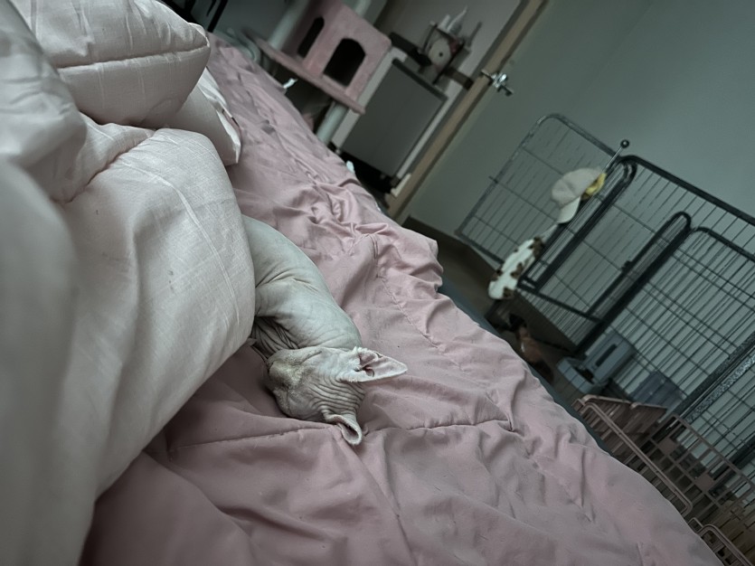 어찌하다 파양당한 스핑크스 맡아주게 되엇는데 집에 강아지도 잇고 고양이도 잇어서 보내요ㅜㅜ 애기 한달간 데리고잇엇는데 감기인지 기침기운잇고 고양이들 사이에선 옮긴 않아요 스핑크스라 손도 많이가고 잘때 인겨서 이불덮고 자요
