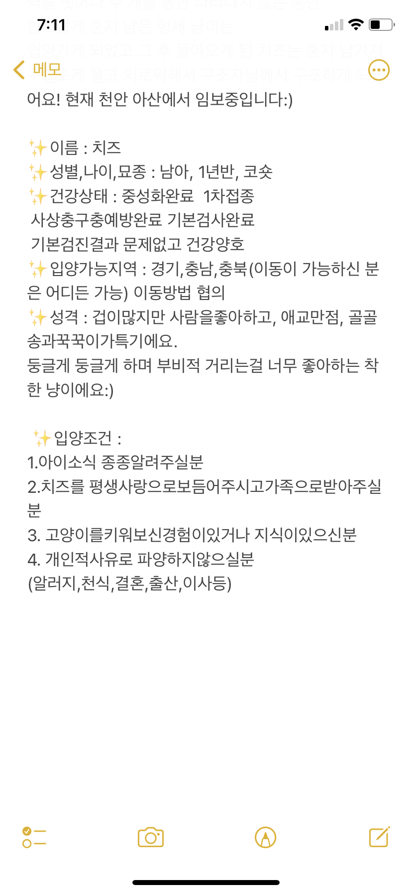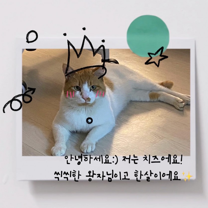 길생활을 하였으나 중성화 수술이 안되었던 치즈가 영역을 벗어나 수 개월 동안 나타나지 않는 동안 안쓰럽게 혼자 남은 형제 냥이는 입양가게 되었고 그 후 돌아오게 된 치즈는 혼자 남겨져 구슬프게 울고 외로워해서 구조자님께서 구조하게 되었어요! 현재 천안 아산에서 임보중입니다:)