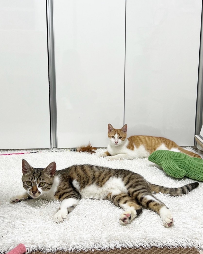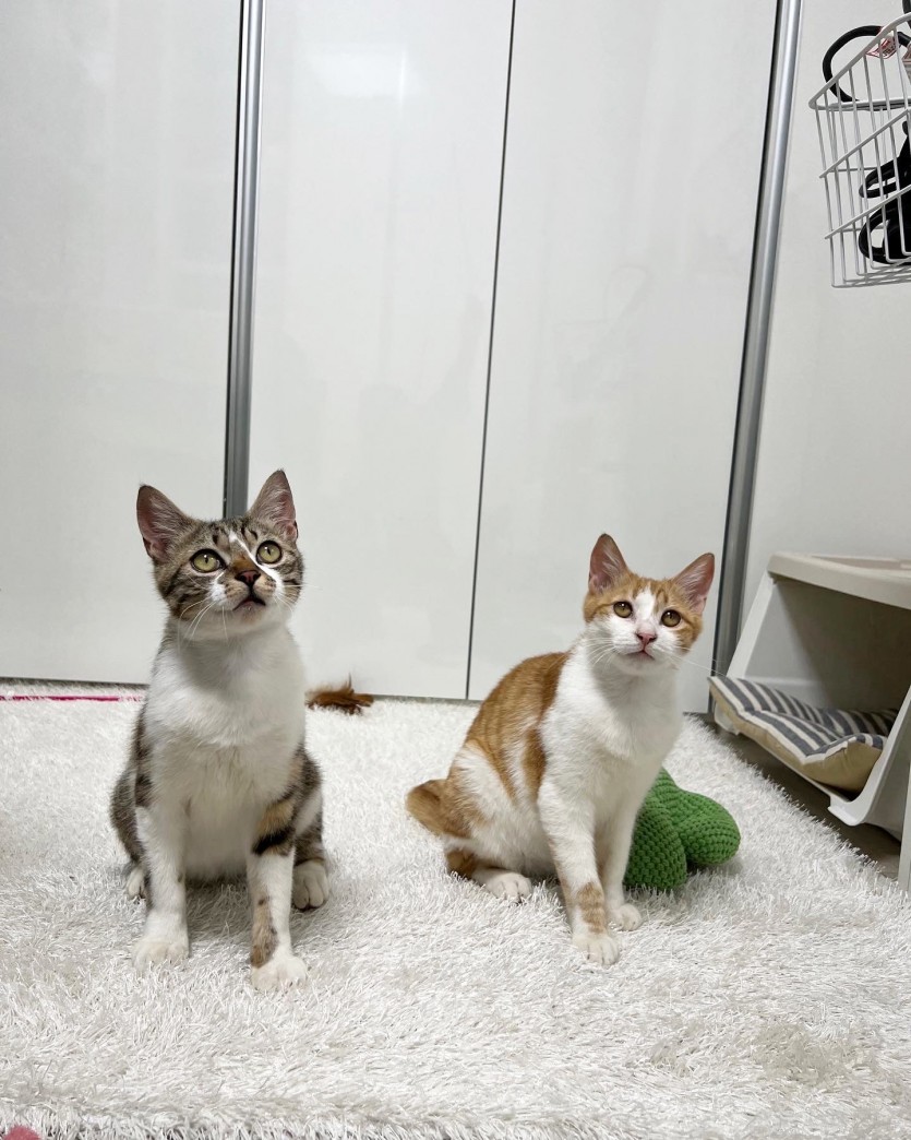 둘다 매우 건강하며, 츄르를 주면 잘 받아먹고 간단한 터치 가능하며 둘다 온순합니다. 약간의 순화와 적응이 필요합니다.