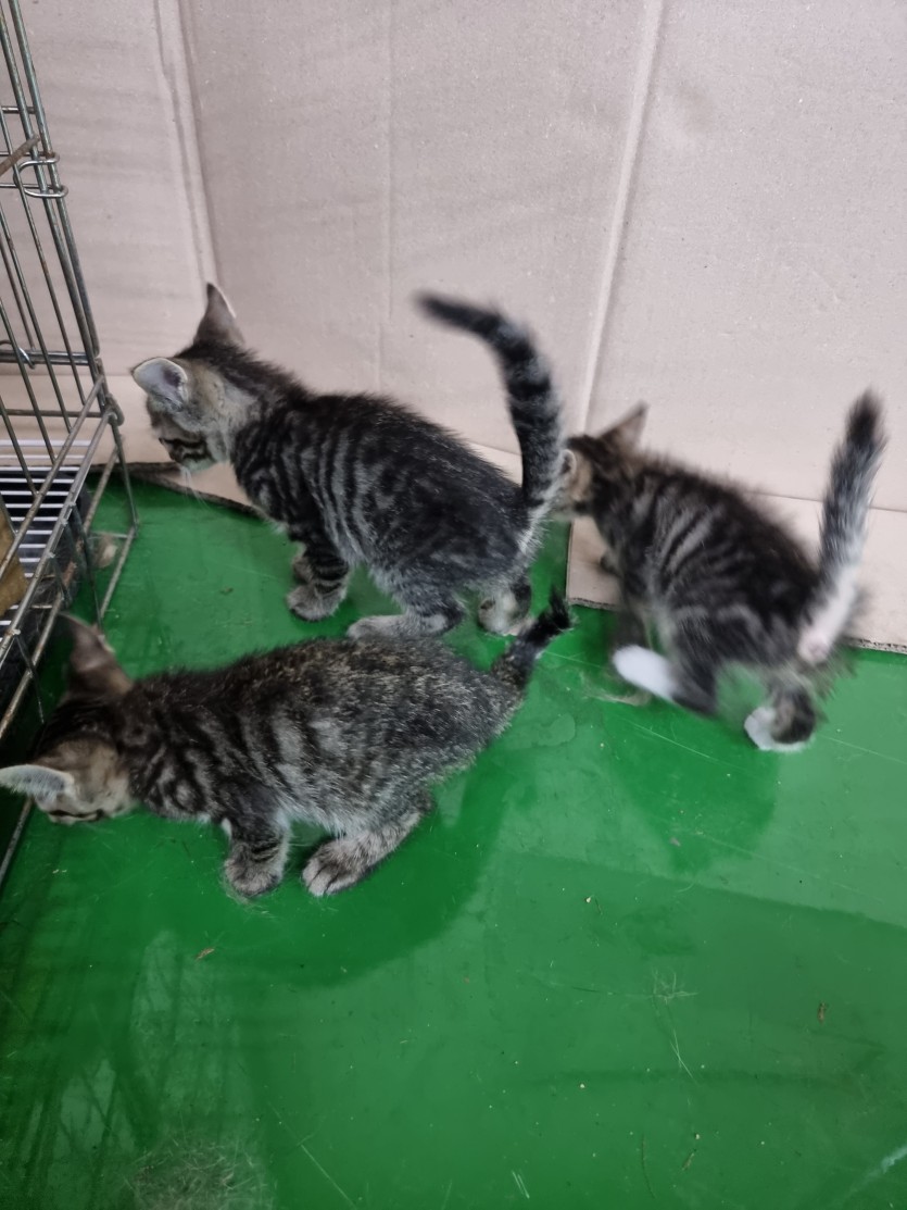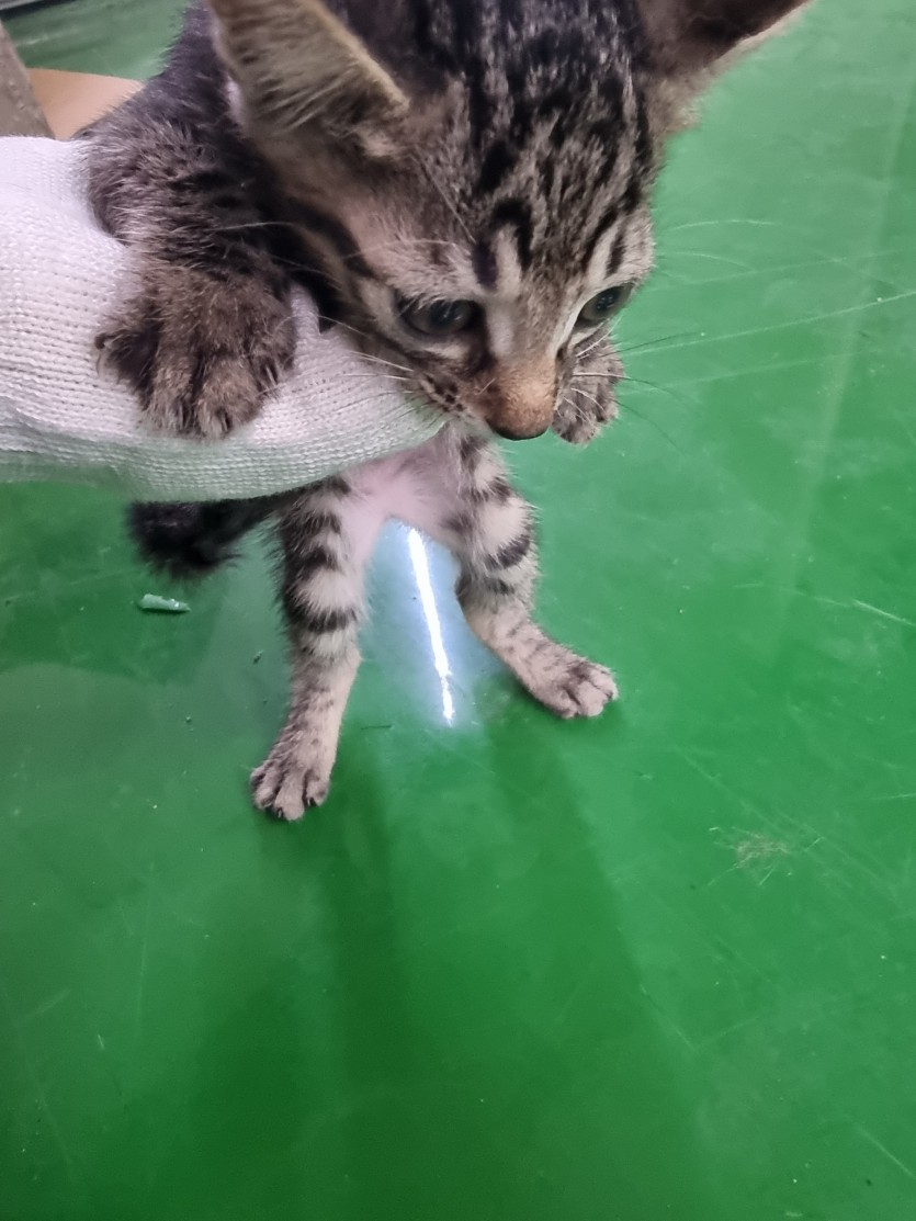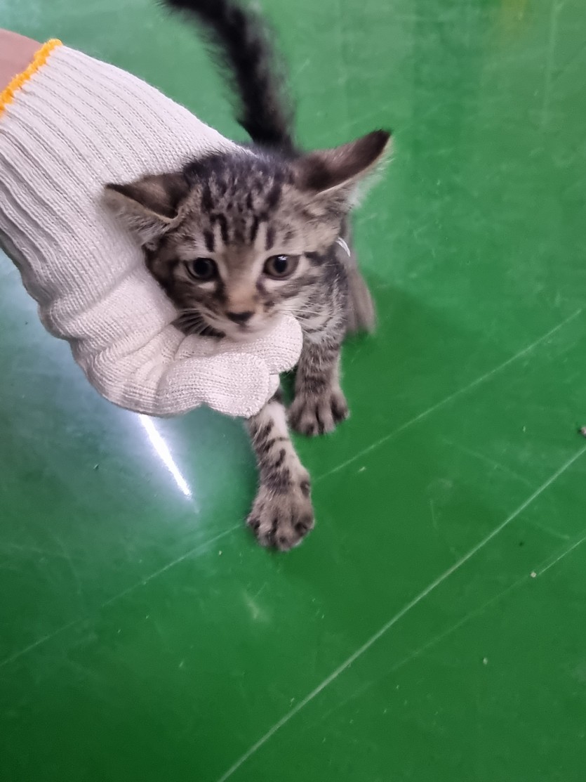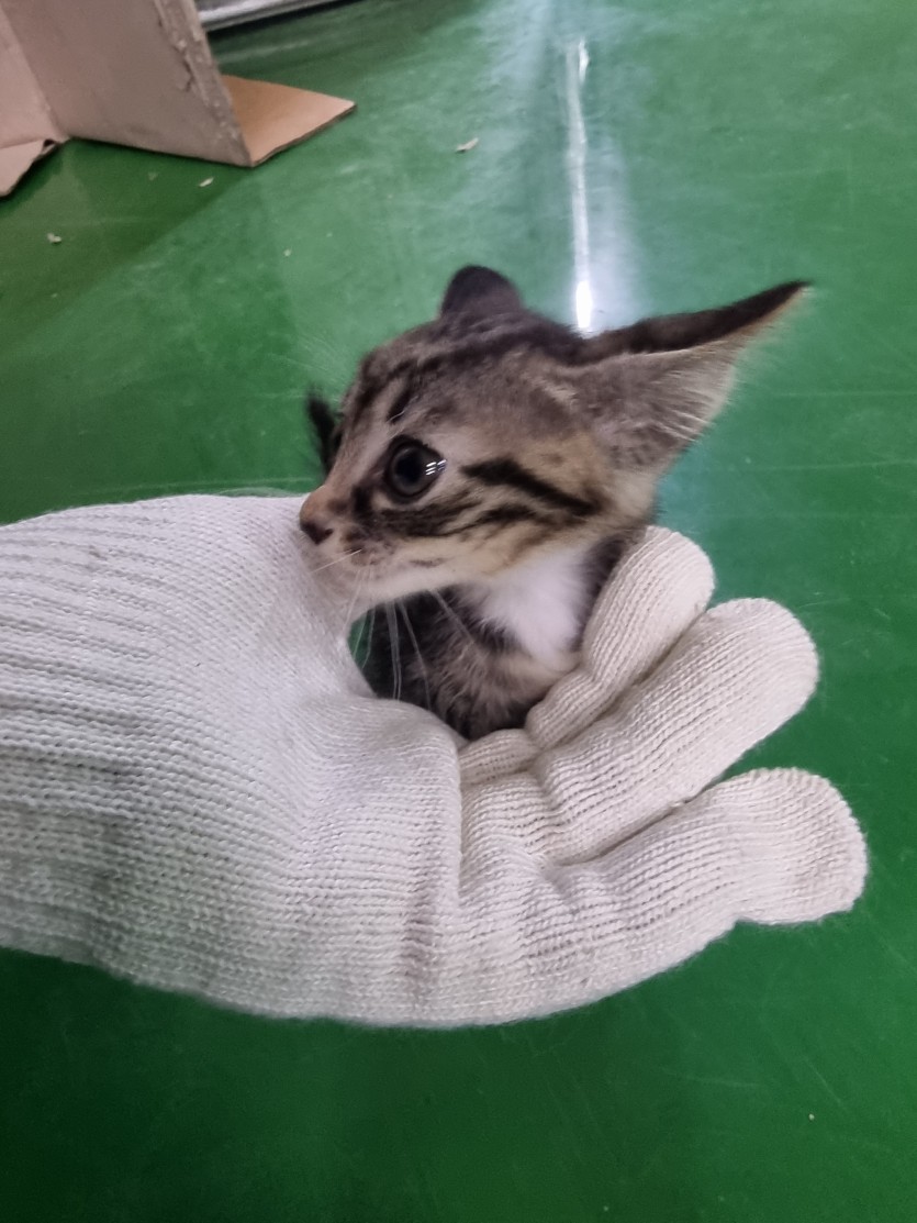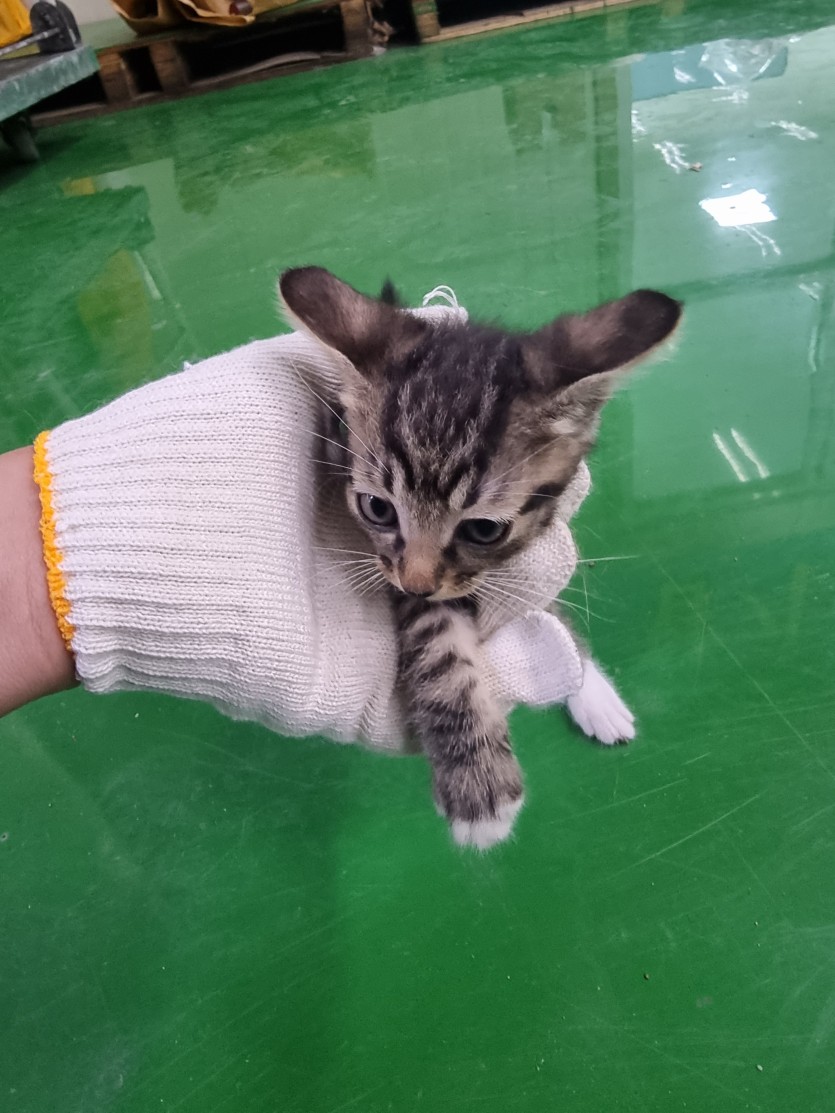 공장에서 키우던 어미고양이가 새끼 4마리를 낳았습니다