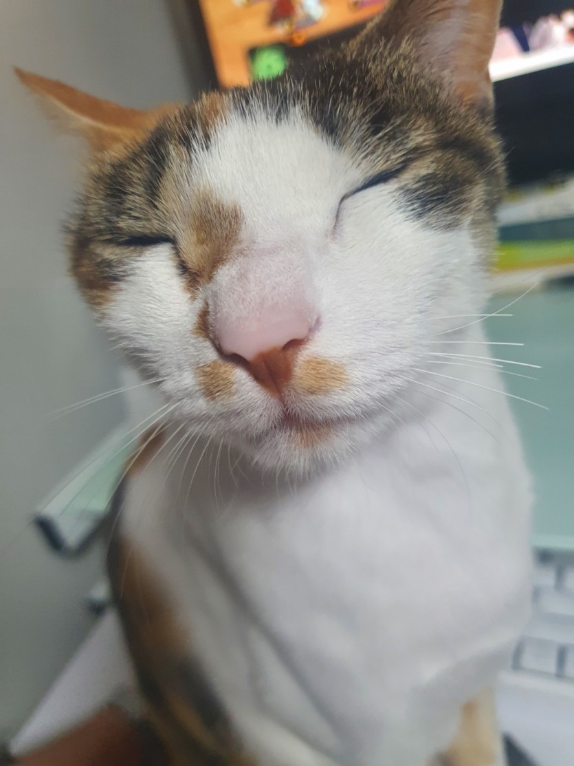 골골소리 잘내구 아무사료나 다 잘먹고 앉아 손 종치는거 총으로 빵하는것까지 다배웠어요 똑똑한고양이에요