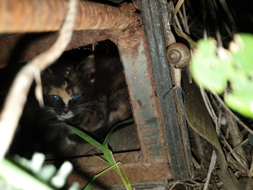 한마리는 다른집 마당으로 들어가는 바람에 놓쳤고 버려진 나무 상자속에 숨어있는 이