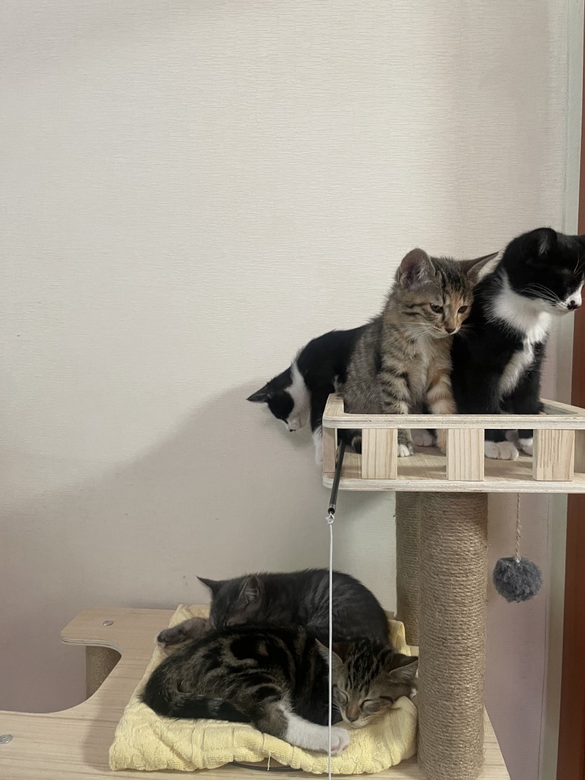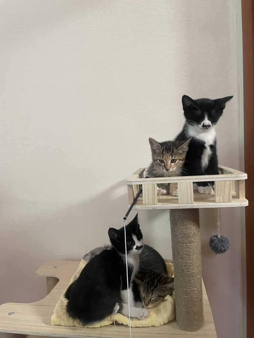 치즈(여아), 턱시도(남아)2마리, 표범무늬 태비(남아) 있습니다.