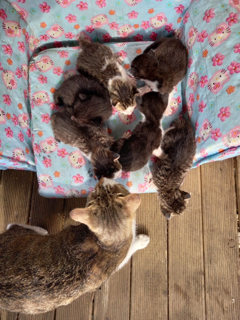 밖에서 키우고 있는 어미고양이가 6마리나 새끼를 낳았어요.