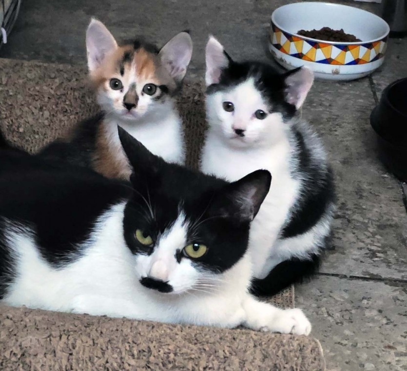 6주된 아가들 입니다. 맨앞줄은 어미이고, 삼색이는 여아, 블랙(2)은 남아입니다. 아직 1kg가 안되어 접종시작은 못했습니다. 인천 논현동이예요. 서울인천경기는 직접 데려다 줄수 있습니다.
