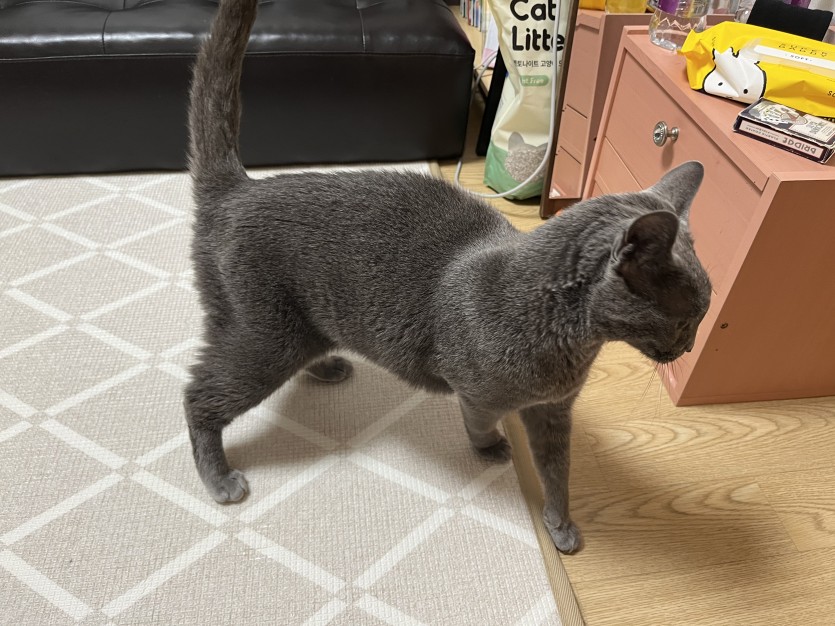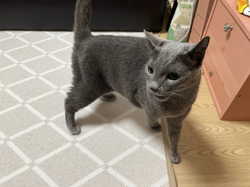 러시안 블루 남아 나이는 1세에서 2세 사이 추정되고 중성화 수술된걸로 보입니다. 건강상태는 매우 양호하고 순하고 애교많은 개냥이 입니다.