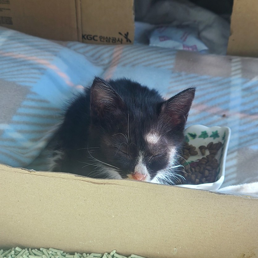 데려와서 보니 어미에게 유기 되었는지 탈수가 와있었죠. 약3일 후부터 밥을 폭풍 흡입하여 지금은 이쁘게 성장하고 있는 턱시도입니다.