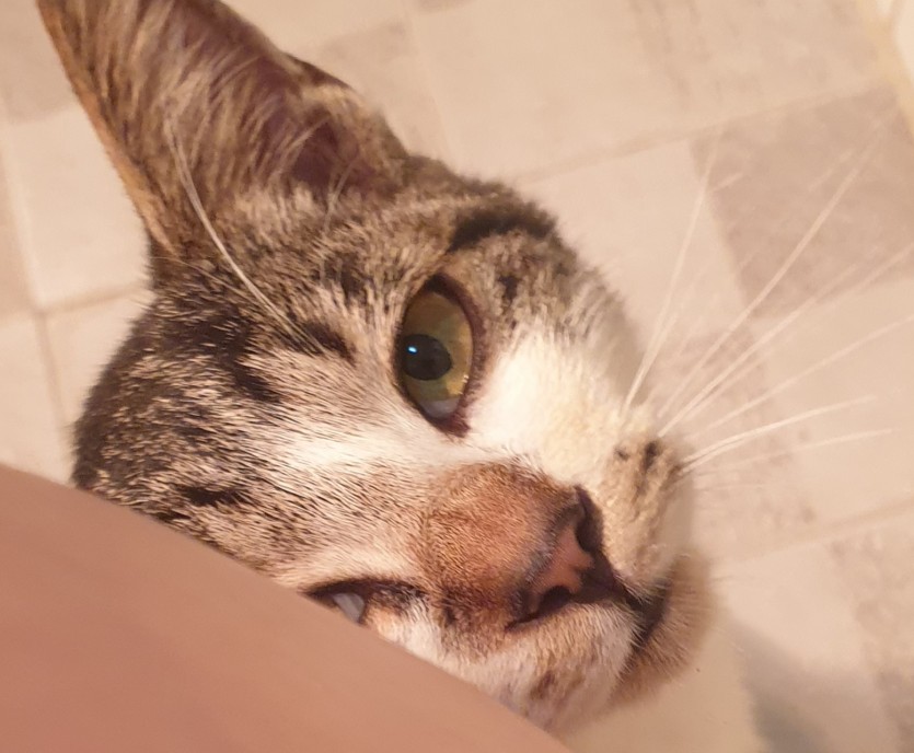 야옹소리 한번 내지 않고 잡고 만져도 큰 반항 못했는데 경계가 좀 풀어져서인지 밥 달라고 소심하게 야옹하기도 함.