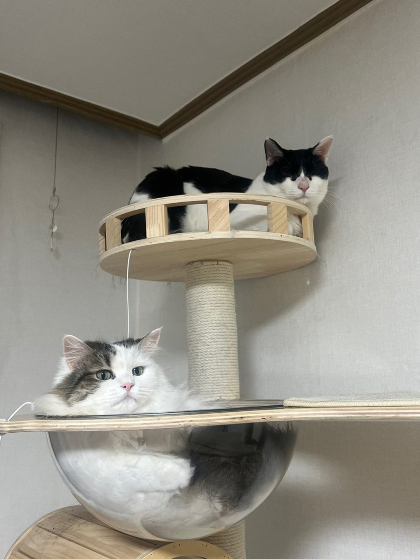 둘 다 순한 성격으로 둘이 잘 놀고, 싸우는 것 한번도 본 적 없이 사이가 좋습니다.