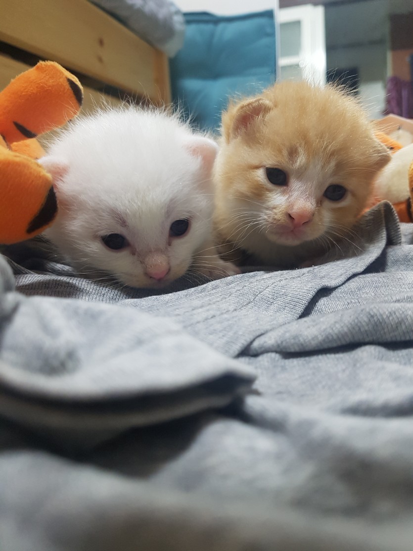 2주됐으며 흰색은 암컷.갈색은숫컷입니다.