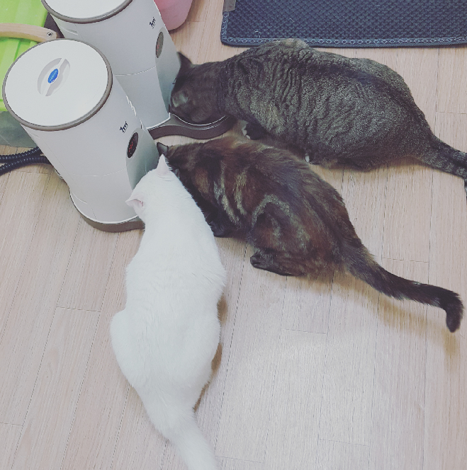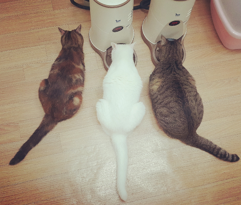 셋 모두 동일한 모래를 사용하고, 동일한 사료를 먹고 있습니다.