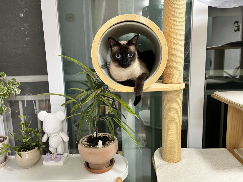 기분 좋을 때는 헤드번팅을 마구하는 애교쟁이고, 캣타워 투명볼에서 주로 낮잠을 잡니다.