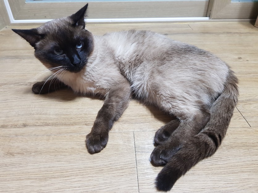 꼬리 부분이 휘어있습니다. 건강상의 문제는 없으며 입양당시부터 휘어있었습니다.