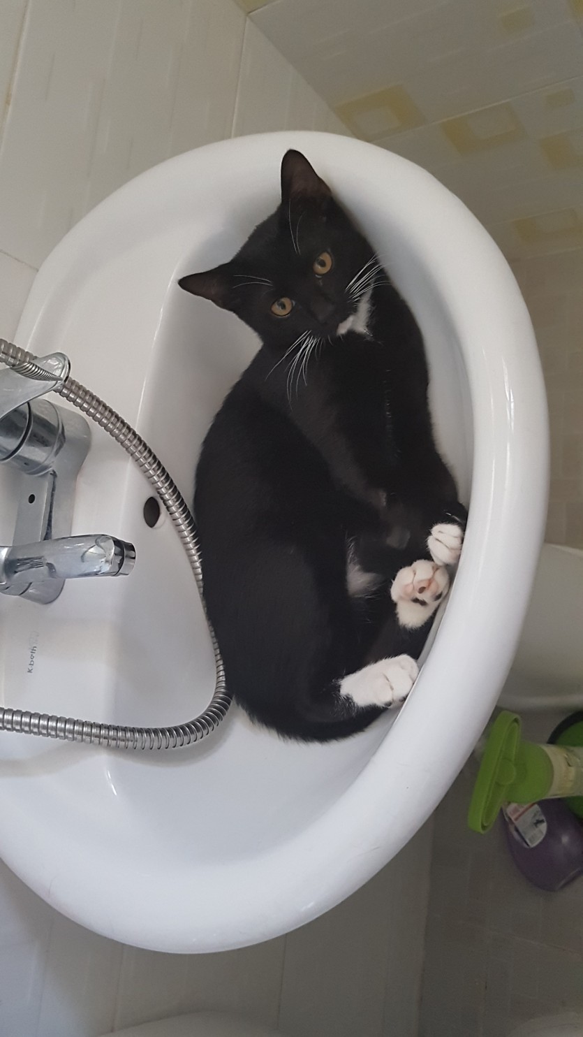 둘째 초코는 검은색 냥이입니다. 수컷이고 시크하면서도 장난기 있는 츤데레 입니다. 특히 턱과 배 네발이 하얀데, 양말 신은것처럼 귀여운게 매력입니다. 물에 호기심이 많아서 세면대에서 종종 휴식을 취하네요. 꼬리 끝부분이 "ㄱ"자로 꺾인게 특징입니다.