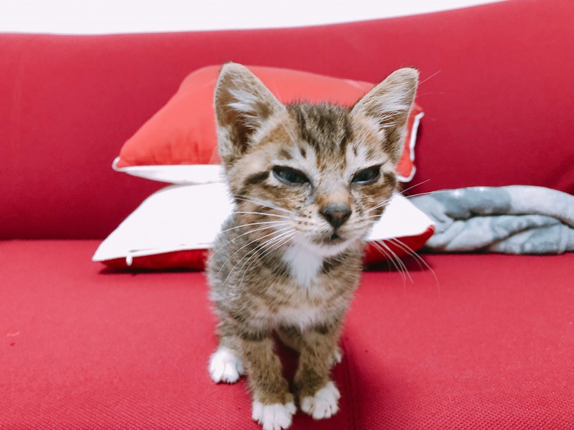 비 오는 날 차 본넷 안에서 이틀 째 울고있는 아이를 구조해서 임시보호 중입니다. 병원에서 간단한 처치 후 건사료 적응중인 2~3개월 남아(수컷) 아기냥입니다.