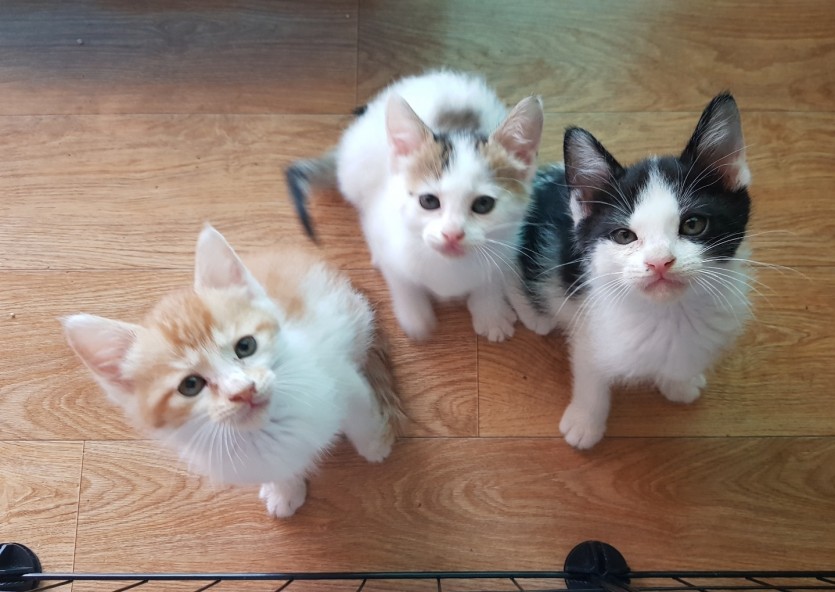 삼색냥 암컷, 치즈냥 수컷, 턱시도냥 수컷입니다.