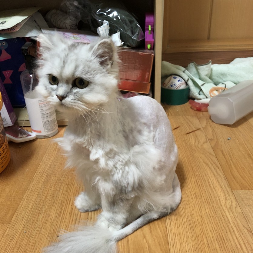 샵에서 계속 분양이 안되고 있어 데려온지 한달정도 되었구요 털은 뭉침이 너무 심해서 밀었습니다 배부분 털뭉침 아직조금 남아있구요