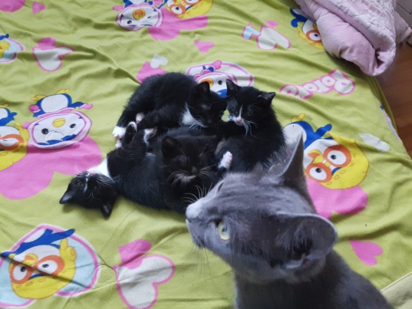 어미는 러시안블루 1년3개월정도 됬고요 아기는 2개월 조금 넘었는데 아기종류는 잘모르겠어요.
