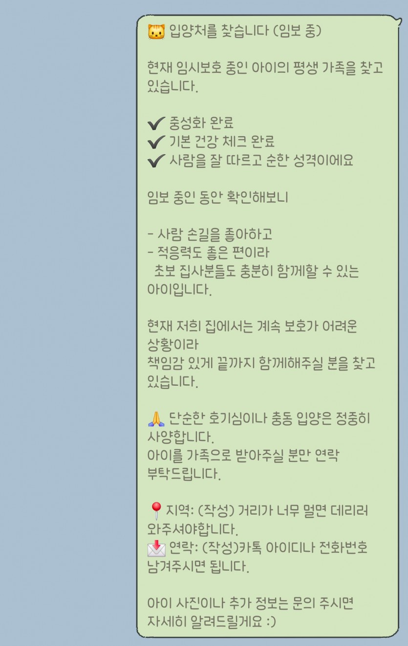 현재 저희 집에서는 계속 보호가 어려운 상황이라 책임감 있게 끝까지 함께해주실 분을 찾고 있습니다.
