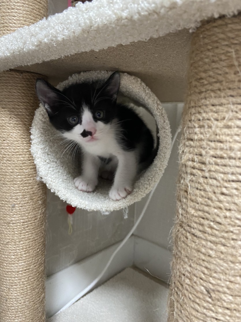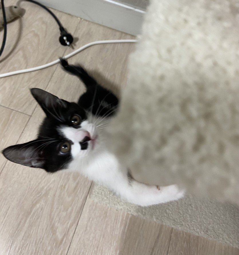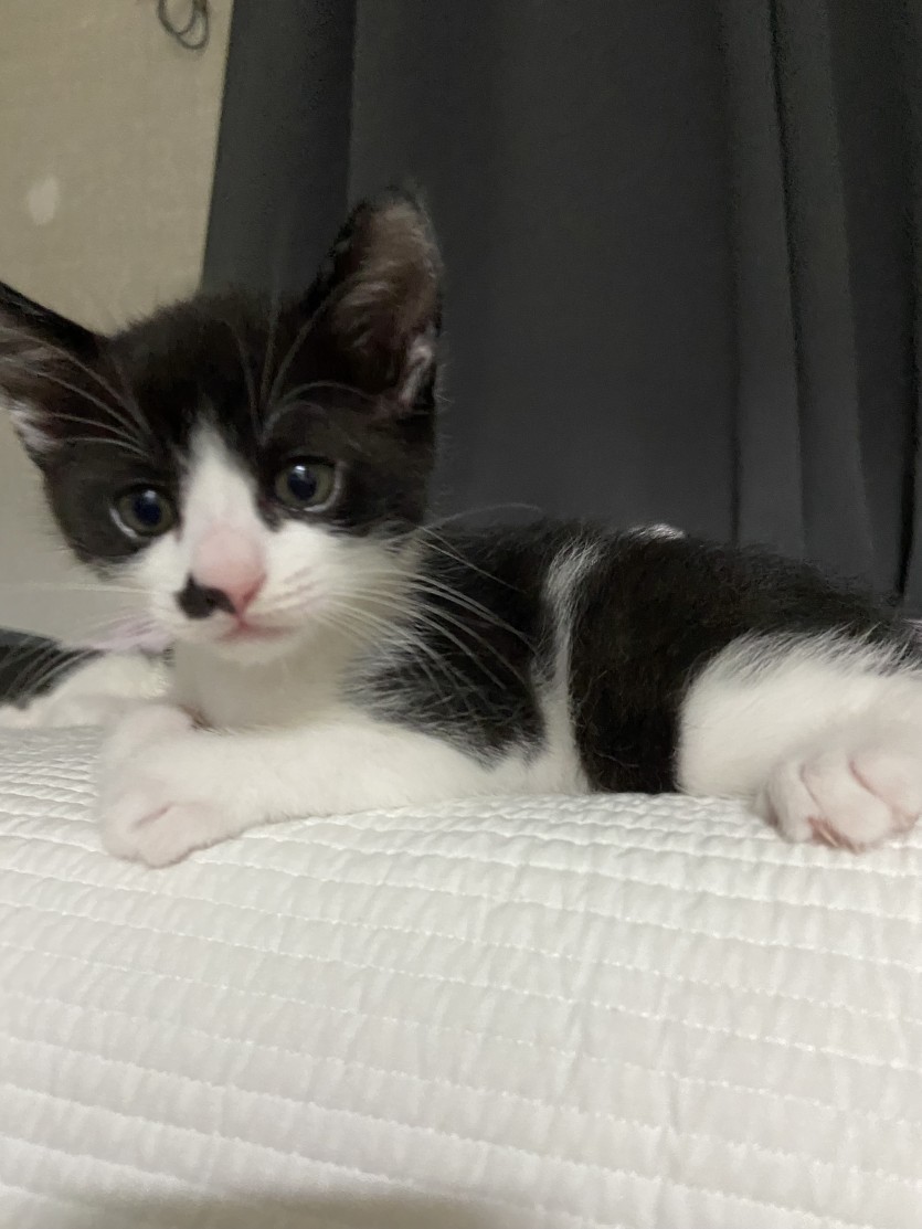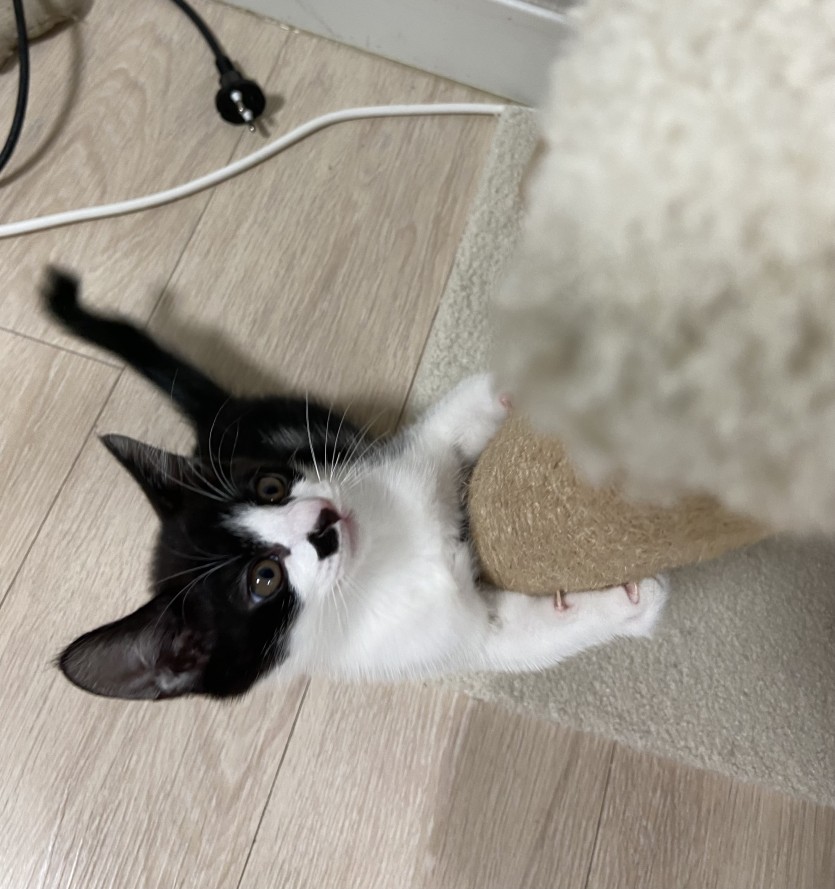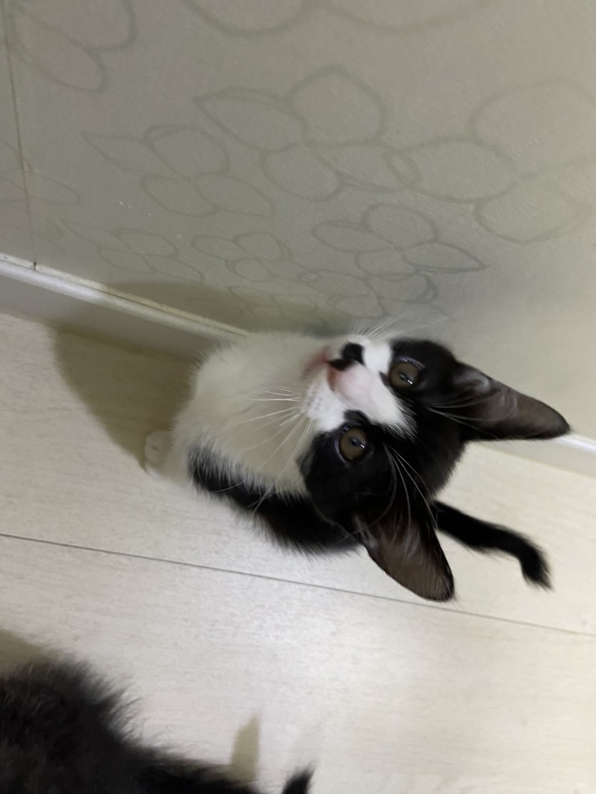 제가 돌보던 길고양이를 병원에 데려가니 임신중이였습니다. 그래서 집에 데려와서 돌보았고, 아기고양이를 출산했습니다. 총5마리를 출산했기 때문에 한마리씩 입양 보내고 있습니다. 집에서 태어났고 집에서 자랐기 때문에 산책냥이 절대 안됩니다ㅠㅠ 다른 동물 조차 무서워해요ㅠㅠ 집에서만 있었기 때문에 눈도 못 뜰 시절부터 사람이랑 같이 있어서 사람에 대한 경계심이 없고 사람을 너무 좋아합니다. 어미에게 배변훈련과 사회성을 훈련 받아서 잘 놀고 잘 먹고 잘 잡니다