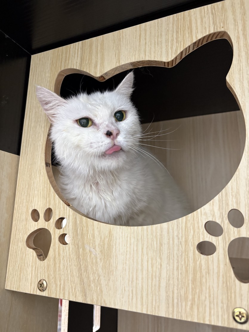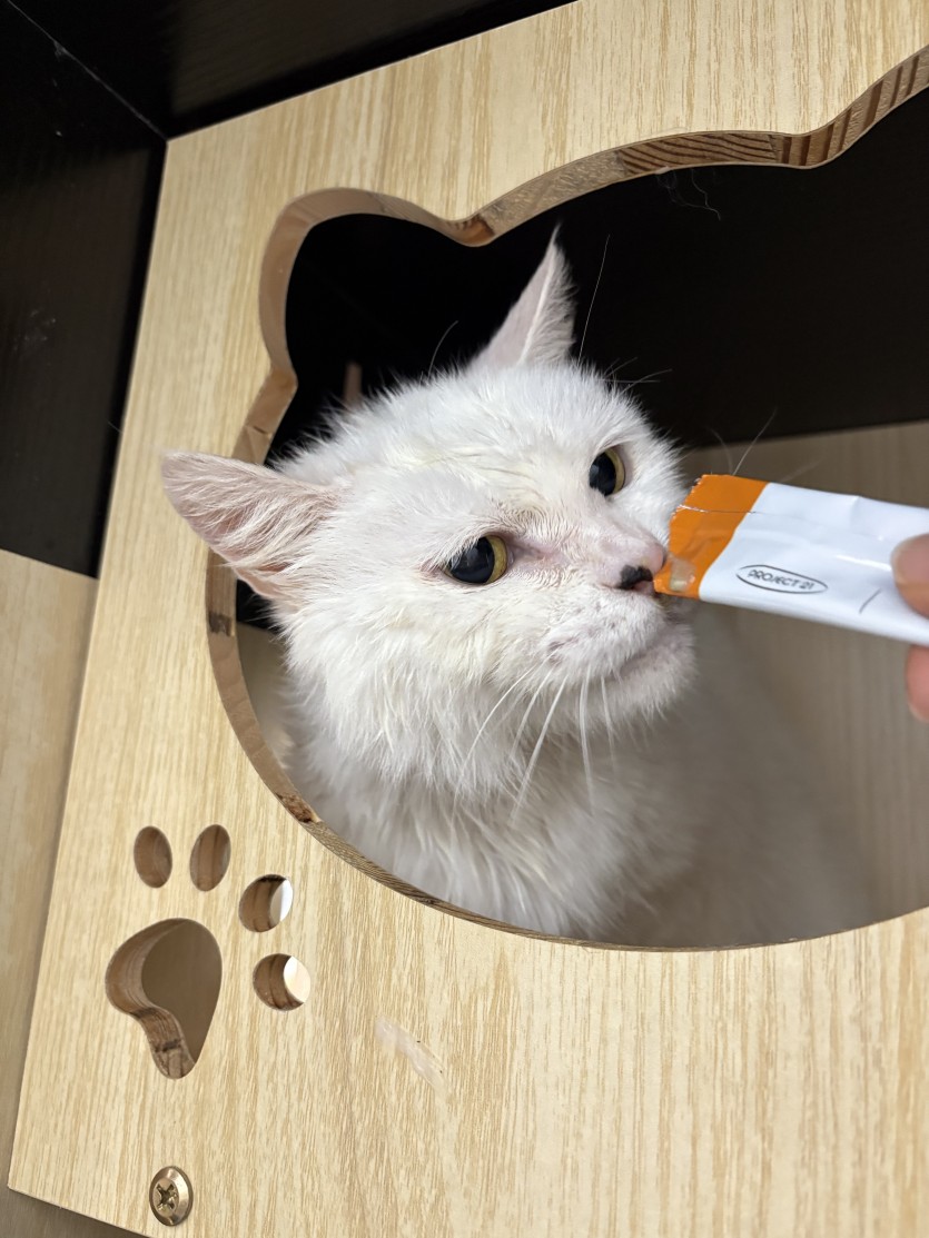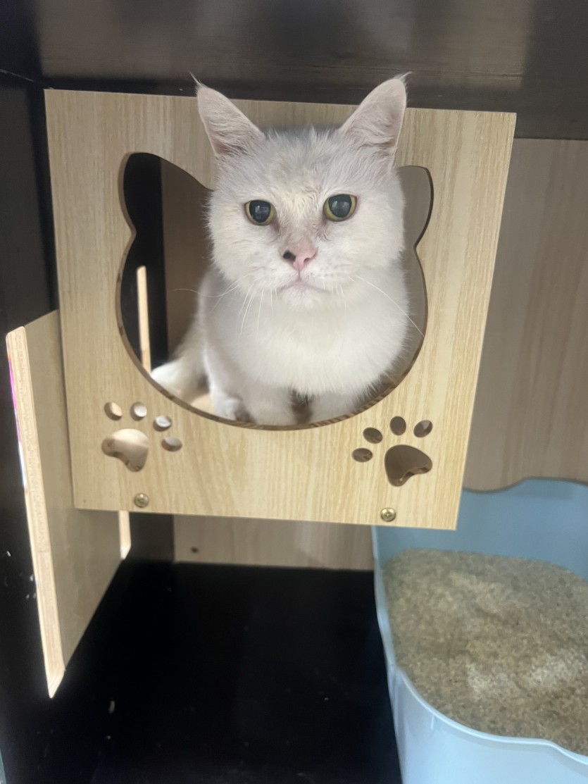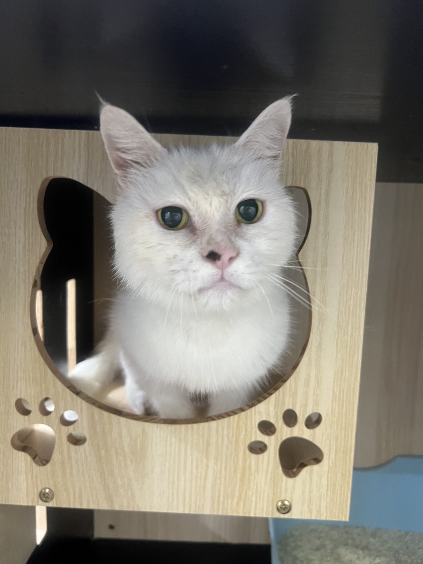 흰둥이의 성격은 조금의 겁이 있지만 온순한 성격이며, 현재 밥과 물, 약도 잘 먹는 아이에요