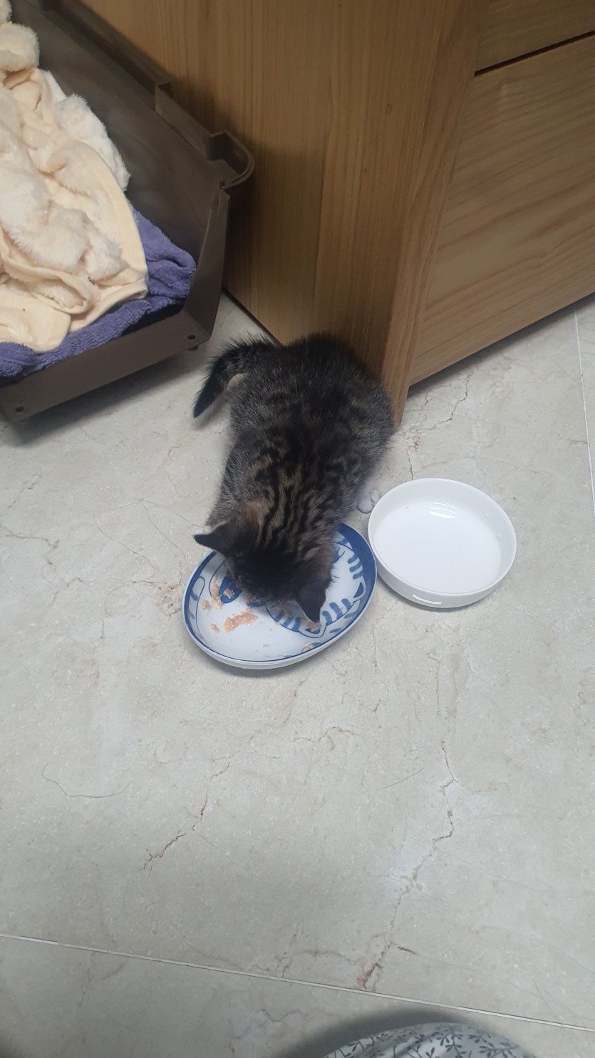 집 근처에서 몇일간 어미 없이 혼자 울고있길래 데려와 임시보호 중입니다.