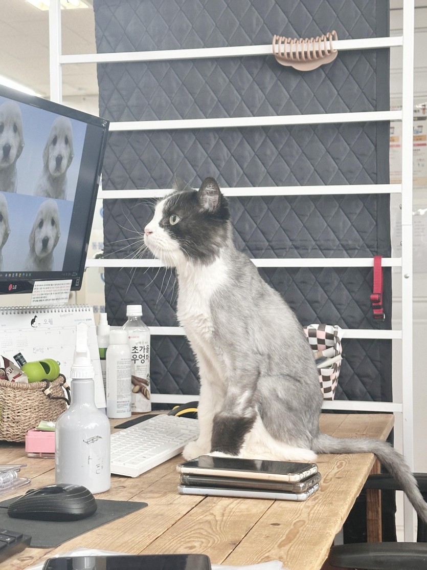 선생님들이 일하고 있는 책상위로 폴짝 올라와 관심달라고 골골거리면